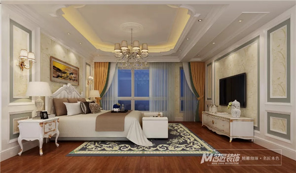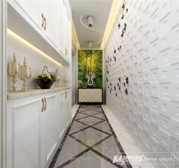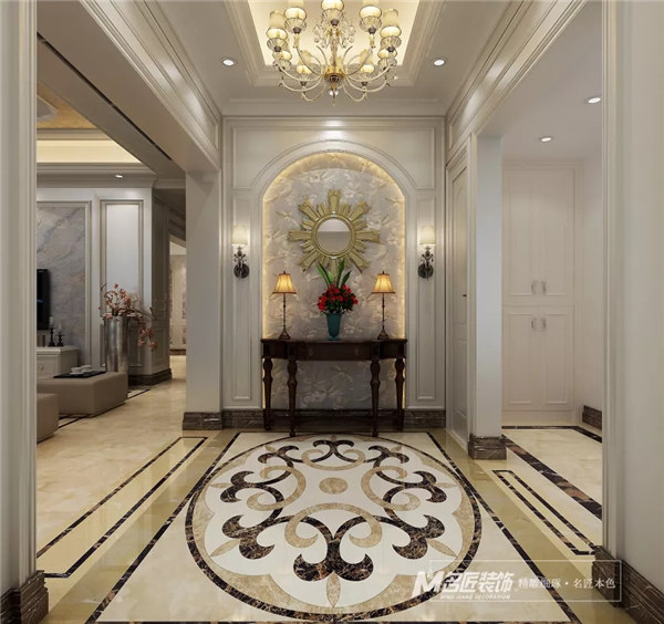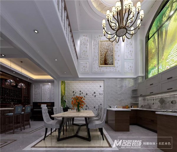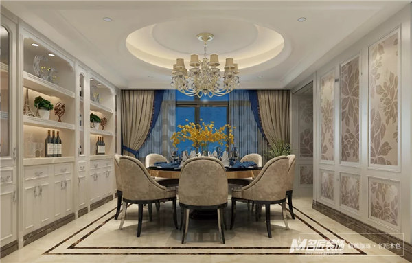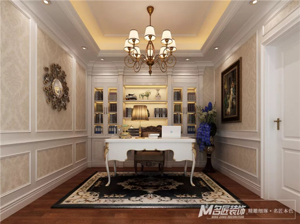 客廳,采用素雅的歐式風格護墻板裝飾,顯得精致大方,配上風格獨特的水晶燈,高貴大氣。空間設計層次分明,襯托出整個空間的質感。
