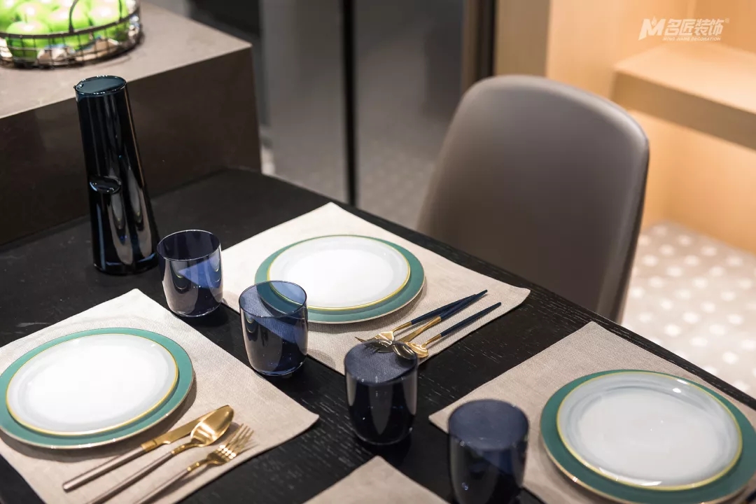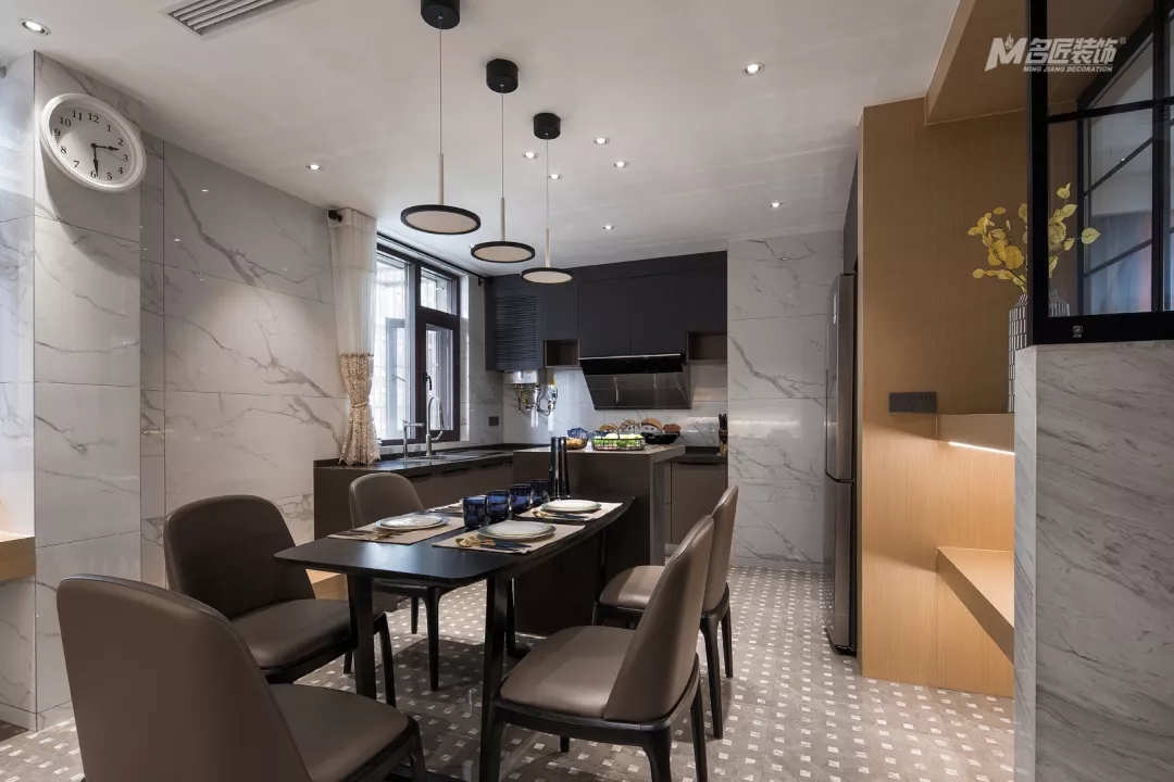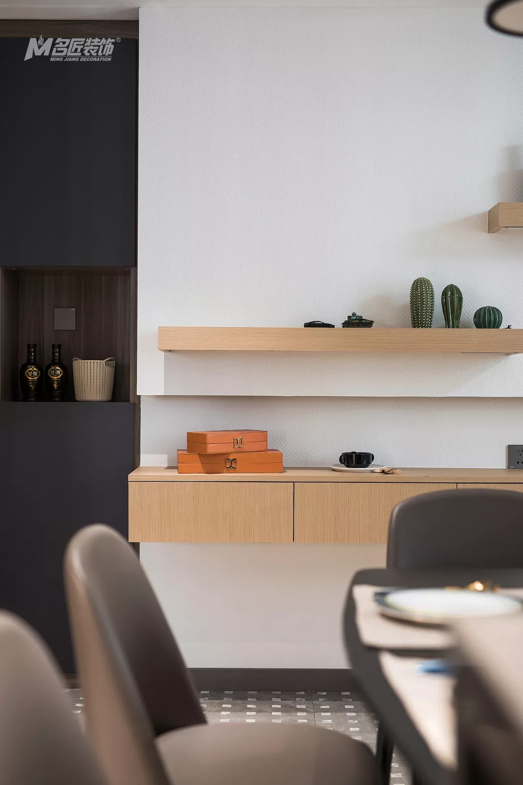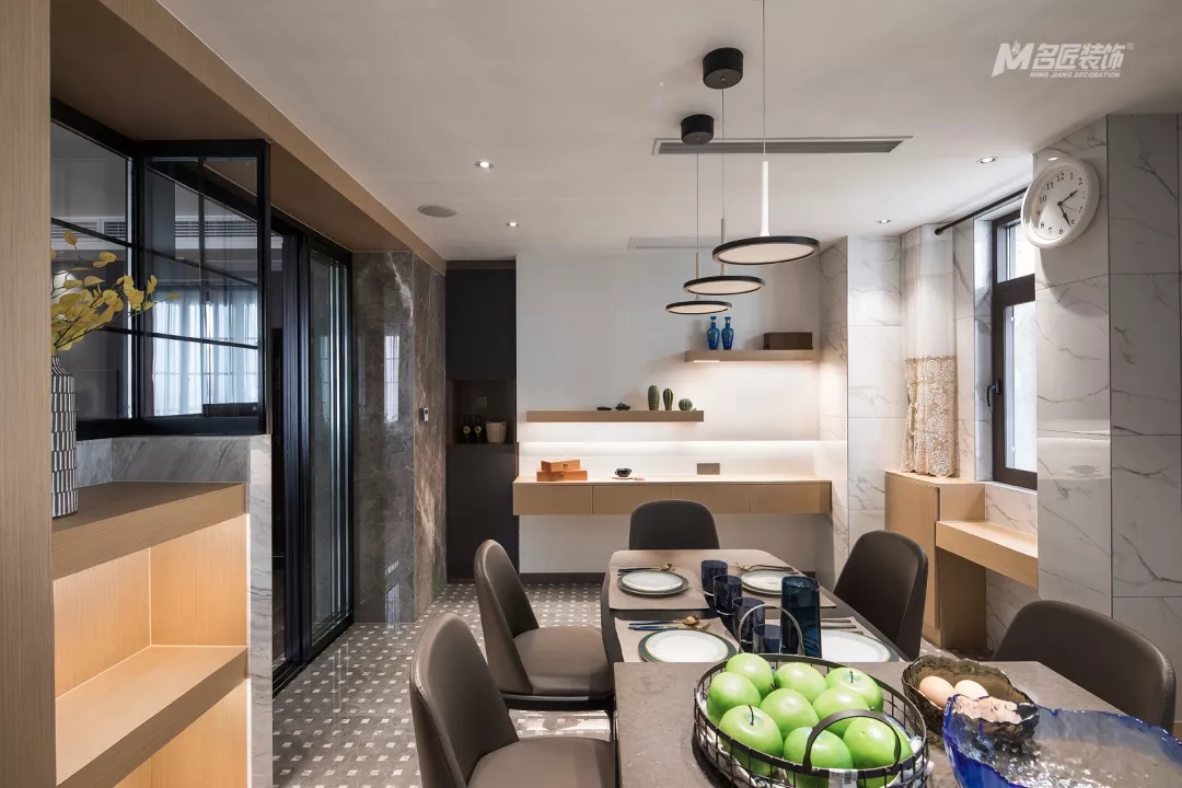 廚餐廳的另一端,墻面設計了木制隔板并裝飾了一些小物品,為烹飪、就餐時光增添了不少情趣。