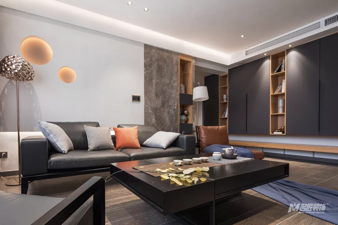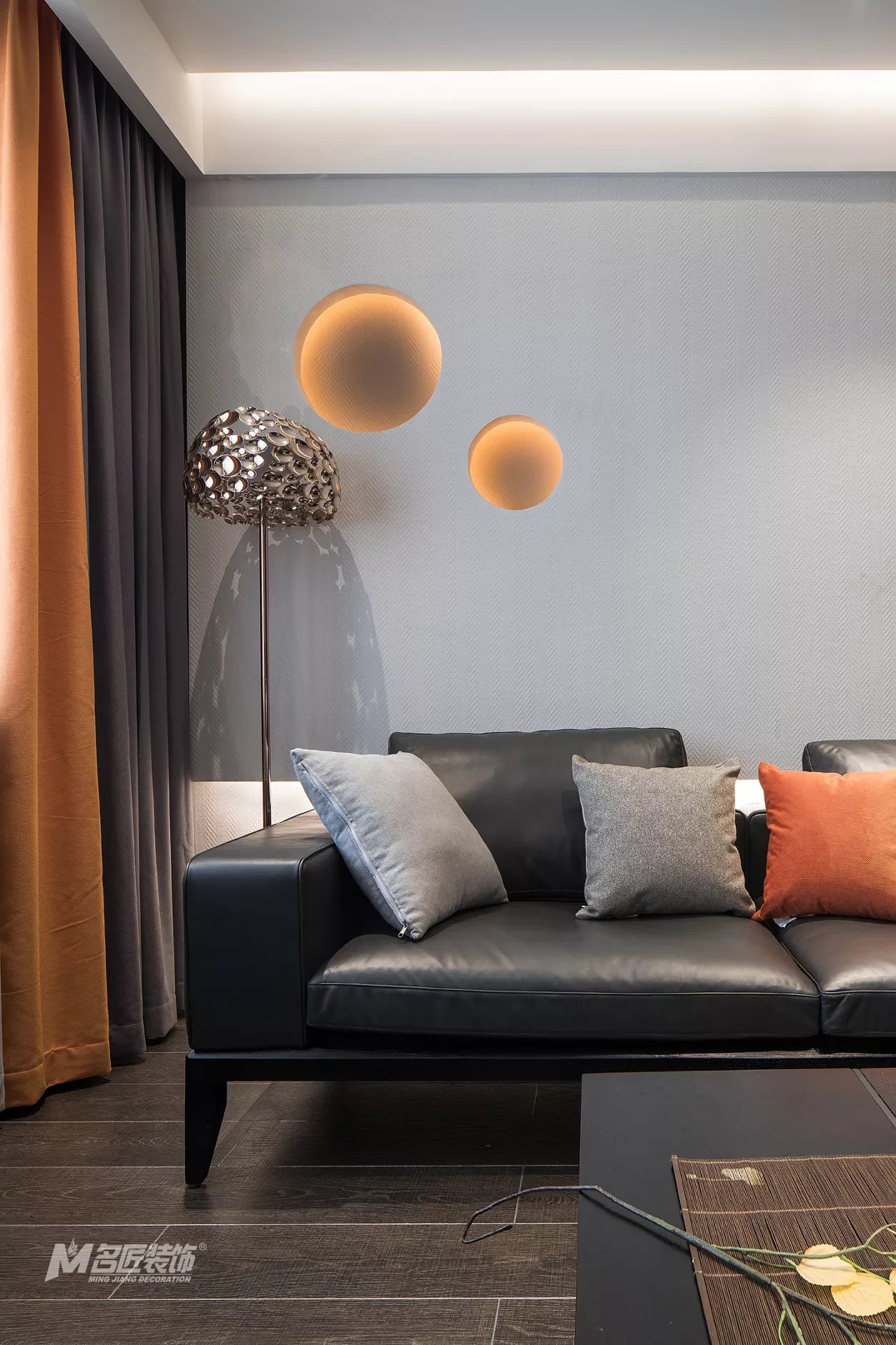 整潔清爽的客廳,由高級灰搭配著原木色、愛馬仕橙,時尚氣息濃郁,又有著自然的溫暖感受。